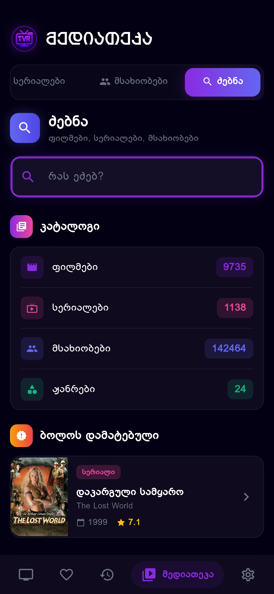 ნანახი არხების ისტორია და ფილმების კატალოგი (VOD).