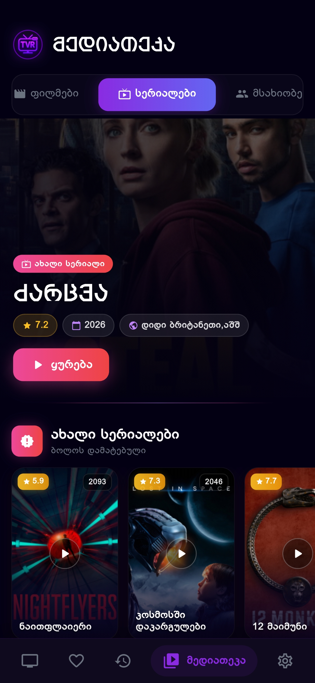 პირდაპირი ეთერის სტაბილური სტრიმინგი მრავალფეროვანი არხებით.